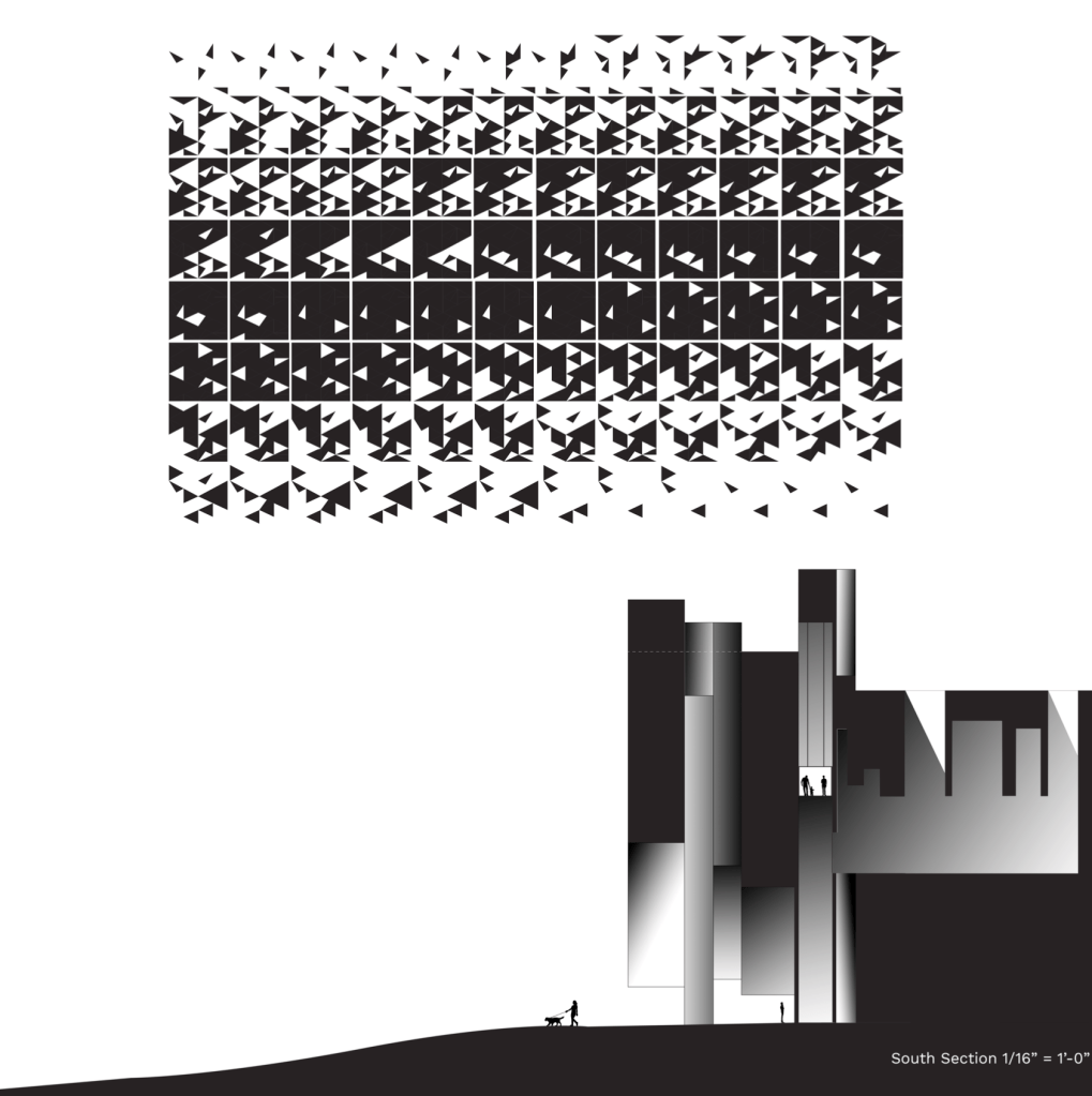 Devising a grid within a bounding box in order to explore different repetitions of positive and negative spaces. Beginning with more constricted rules, the spaces formed particular patterns within the box and then as rules were abandoned and reformed, the same spaces appeared more sporadic, while maintaining the same language. The resulting model was then meant to be placed in nature at an appropriate scale in order for these patterned spaces to become physically inhabited.