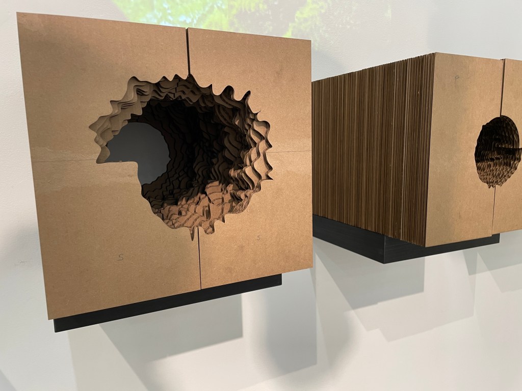 This exhibition was meant to extract the data from music pieces and display different ways to create an alternate relationship to listening. The field recordings were initially created in order to cater a musical experience at their specific locations. In order to exhibit this project in one location, the relationship between the recording and the place had to become fractured. This fracturing allowed for the work to focus on deconstructing the recordings themselves as assemblages of musical data. This data was then processed to create both digital and physical artifacts to be displayed for the exhibition. The physical aspect consisted of three-dimensional artifacts created from the sound data, while the digital focused on reflecting on this sense of fracturing between the music and the natural spaces they originated from.