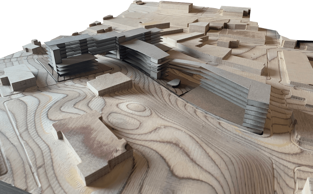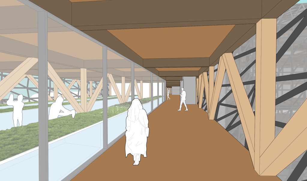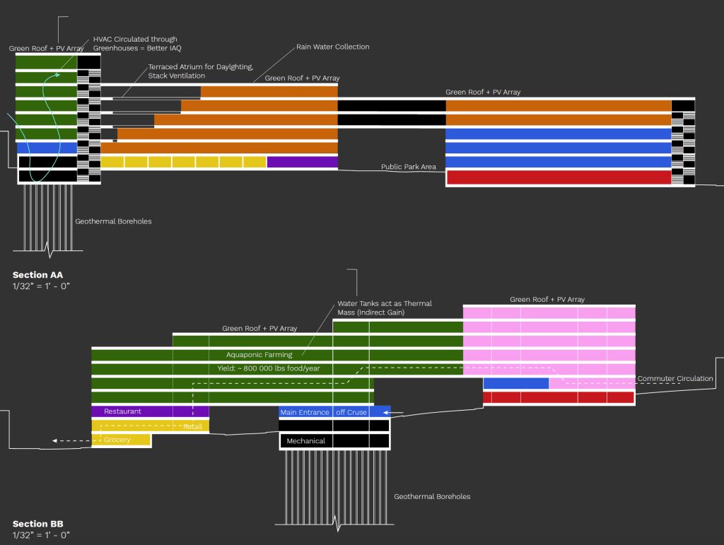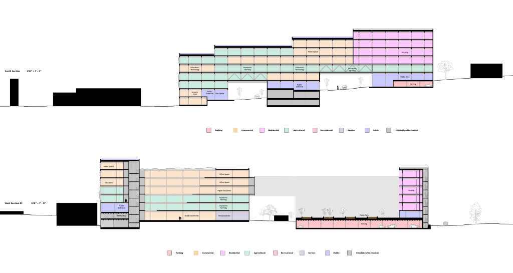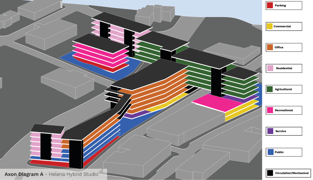 The goal of this project was to redesign several currently vacant city blocks in downtown Helena to create a hybrid building. The belief is that in doing so we can not only revitalize the downtown area, but also help bring more traffic to existing businesses. In addition to residential and commercial program elements, the Helena Hybrid will also include retail, food and beverage, education, light-industrial, recreational, as well as aquaponic urban farming along the south facade. Aquaponic farming has half the water requirement of traditional irrigation and could be a very important development in Southern Montana as the dry climate makes for a poor and often unusable topsoil layer.