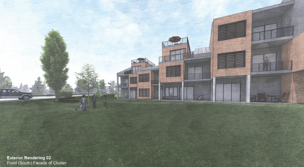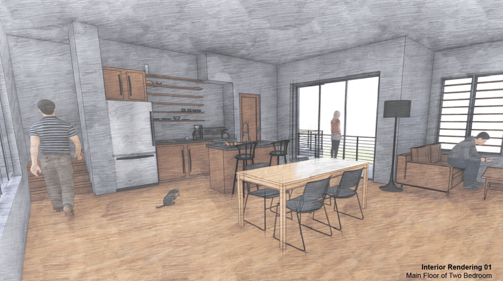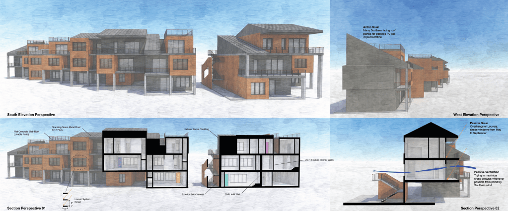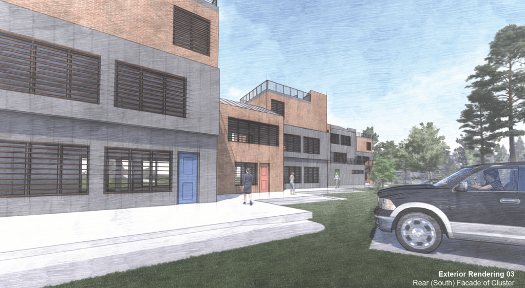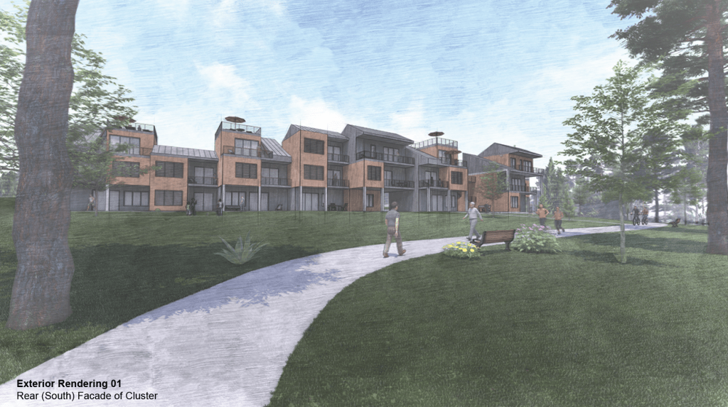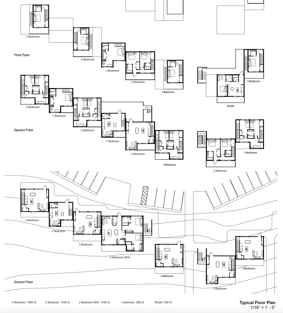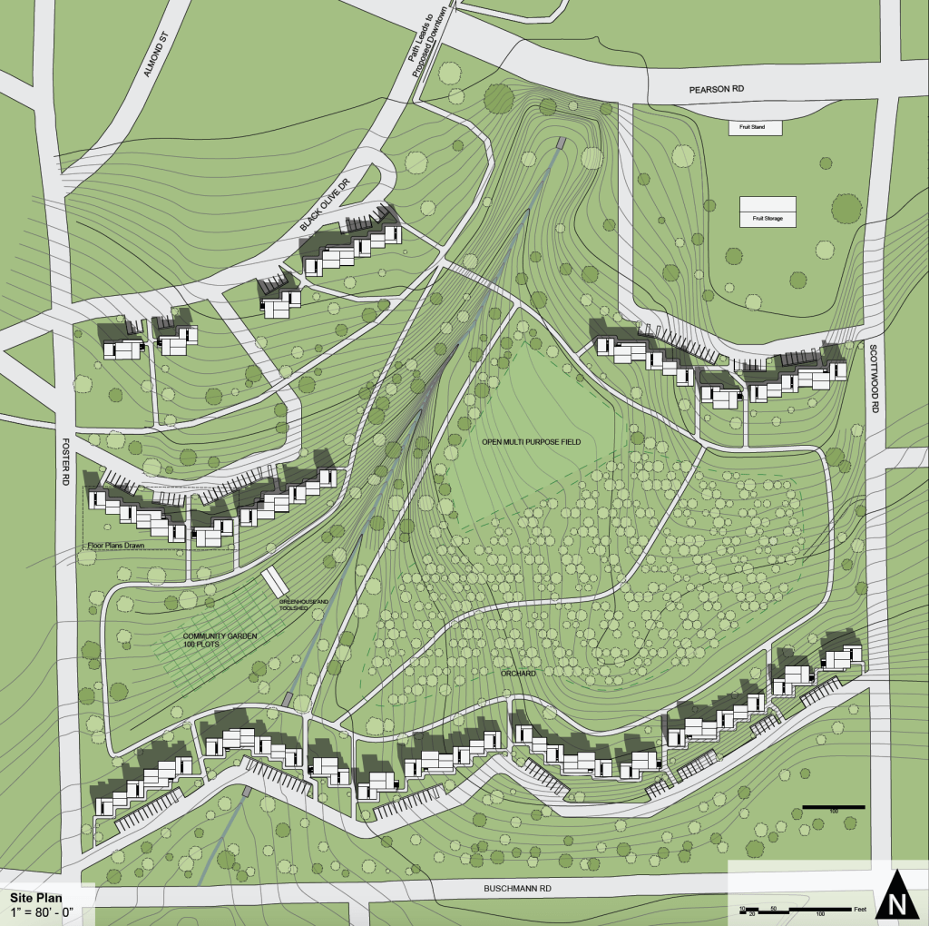 After the devastating Camp Fire of 2018 that destroyed most of the town, the goal of this project was to rebuild Paradise, CA with an interconnected community approach to multi-family housing. By creating a separation of the forest and the built environment, the wildfire defensibility is increased, as is the overall care for the spaces. The community would take pride in their shared green spaces, communally share the maintenance, and also the benefits. The primary design of the site is based on surrounding the community green spaces with the units, giving each unit a north and south face, as well as one face toward the community spaces and one towards the external vehicular circulation. The non vehicular circulation of the site is created from an extension of the existing Paradise Memorial Trail.